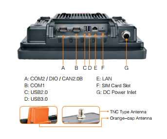 | 其他 | 1 x SIM卡插槽 (推抽式) 1 x 电源接口(航插) 3 x TNC 接口, 用于外置天线 (WiFi, Bluetooth, WWAN, GPS) |