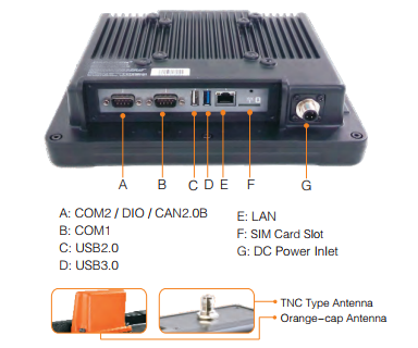 | 其他 | 1 x SIM卡插槽 (推抽式) 1 x 电源接口(航插) 2/3/4 x TNC 接口, 用于外置天线 (WiFi, Bluetooth, WWAN, GPS) |
