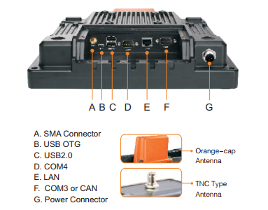 | 其他 | 1 x 电源接口(航插) 2/3/4 x TNC 接口, 用于外置天线 (WiFi, Bluetooth, WWAN, GPS) | |